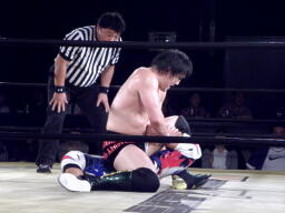 佐藤ヒザ蹴り、日高低空ドロップキック。佐藤アキレス腱固め(左写真)、