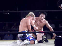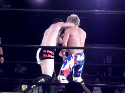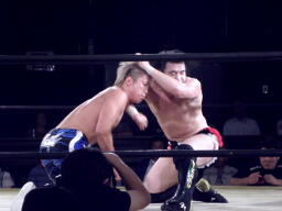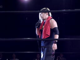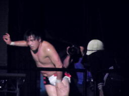 なぜか最後に残った藤田ミノルが締める(左写真)。「どんなにぬるい試合やってると言われようが、最近体が大きくなったと言われようが、もっさりした動きと言われようが、藤田ミノルという生き方に誇りを持ってる。あさって後楽園、俺が優勝すると思う人?じゃ、他の人が優勝すると思う人?微妙だな。それは置いといて、後楽園よりはここより広いです。応援してくれとは言いませんが、それぞれ2、3人ずつ友達を連れてきてください。じゃあ締めます。俺が行くぞー!って言ったらオーって、1回目は声小さいからもう一回行くぞー!って言います。そしたらオー!で。3、2、1、ZERO-1、う〜、MAX!で。え、MAXもうない?それだけ俺が締めるのは久しぶりなんだよ!じゃあ行きます。行くぞー!」「オー!」