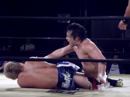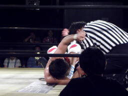 佐藤はレフェリーのシャツを引っ張る(右写真)、しかしついにはタップ。