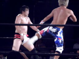 日高左の野良犬ハイキック(左写真)、カウント2。