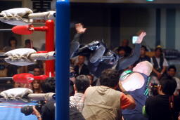 遅れまじとプランチャ、しかしこれはオズに誤爆(左写真)