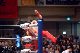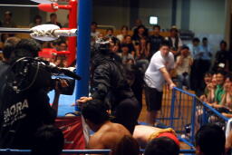 オズとクエルボはKENSOを挑発(左写真)。スペイン語なので何を言ってるのかわからんが「俺たちはKENSOを助けに来たわけではない。我々はAAと全日本の戦争のために来た!」と言ってたそうである(KENSO訳)。