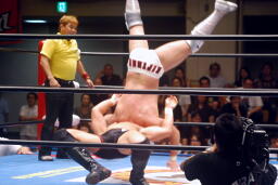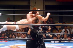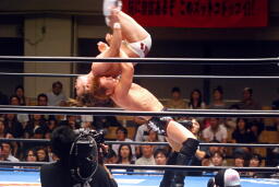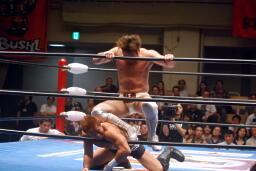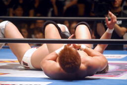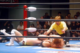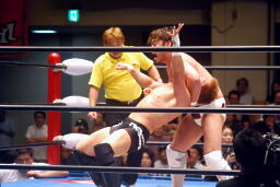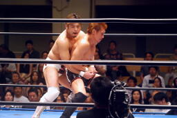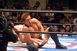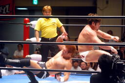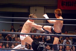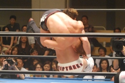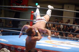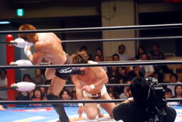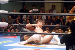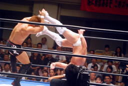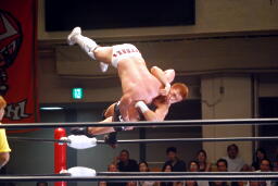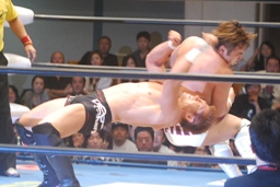ロックアップ、稔がハンマーロックからワキ固めに(右写真)、カズロープ。そのまま場外エスケープ。