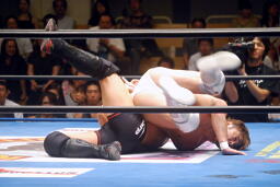 リングに戻ると手四つからリスタート。稔バック取る、カズ切り返す、稔さらに切り返してワキ固めに(左写真)、カズロープ。
