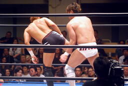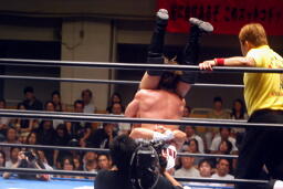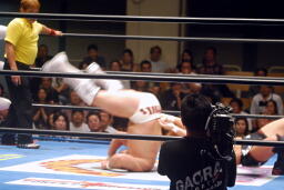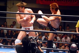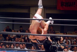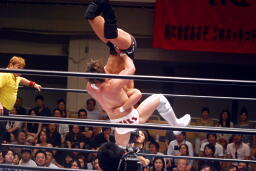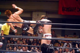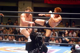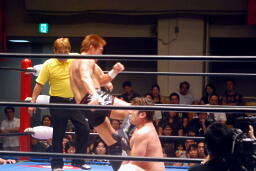 稔ロープに振る、カズハンドスプリングハイキック(右写真)、稔場外転落。