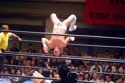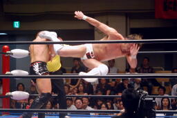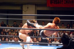 カズスパインバスターからライオンサルト(右写真)、稔ヒザを立ててブロック。