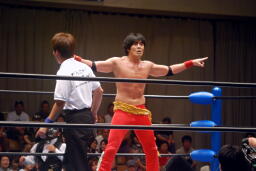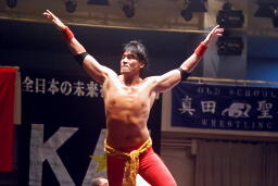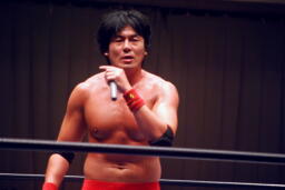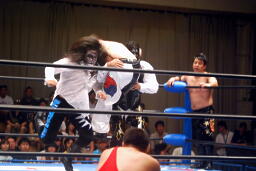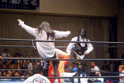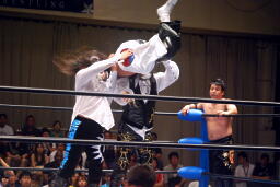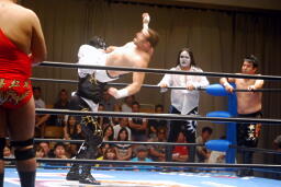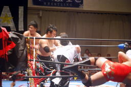 ヤンは2人まとめてDDTに切り返す(右写真)。ヤンはMAZADAに足を捕まえられるがなんとかKENSOにタッチ。