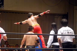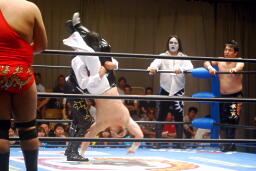 もう一発ボディスラム、ヤンが曹駿の方の上からダイビングボディプレス(右写真)、カウント2。ヤンコーナーパンチ連打、クエルボ抱えて落とす。MAZADAはクエルボにタッチ。クエルボボディスラムからトペ・アトミコ、オズにタッチ。