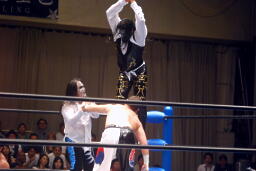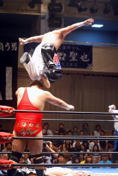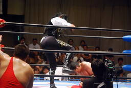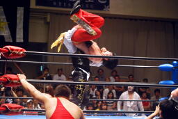 オズはエプロンに出てトップロープ越えのトルニージョ・プレス(右写真)、カウント2。5分経過。