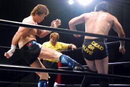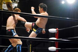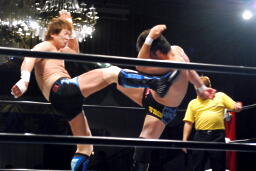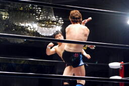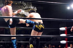 エプロンでミドルキックの打ち合い(右写真)、