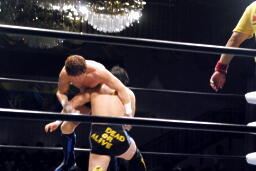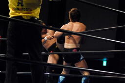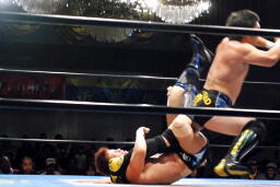 金本は佐藤を場外に出すとトップロープ越しのプランチャ、ロープに引っかかりでもしたのかエプロンに落下(左写真)。