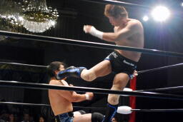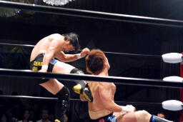 佐藤ハイキック、金本かわして佐藤を転がす。金本背中にキック(右写真)、ストンピング連打。