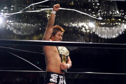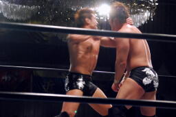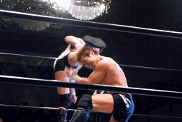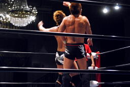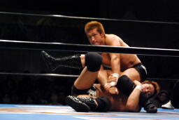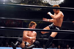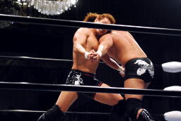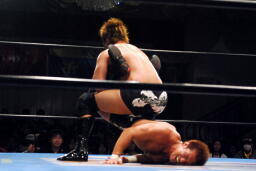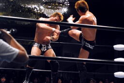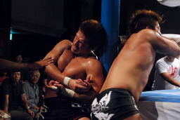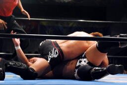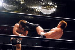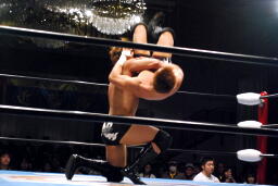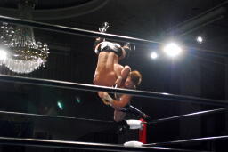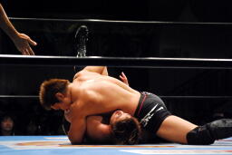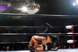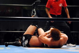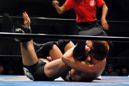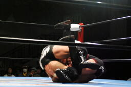 ロックアップ、KAIバック取る、稔腕取って切り返す、KAI切り返す(左写真)。稔さらに切り返すがKAIはヘッドロックからフライングメイヤー、稔ヘッドシザーズでブレーク。