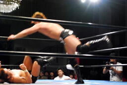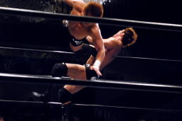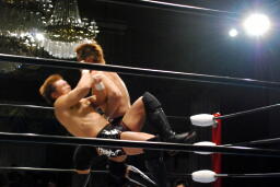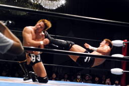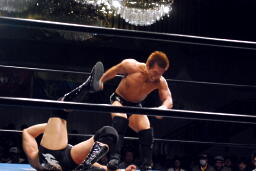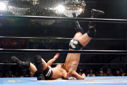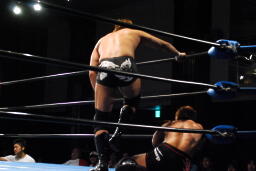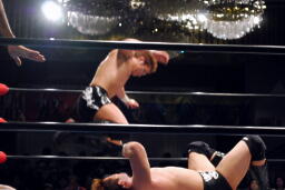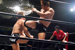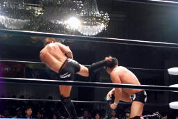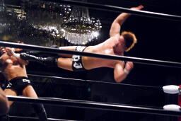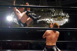 稔はカウント8で戻る。KAIコーナーに振って串刺しダブルニーアタックからボディスラム、コーナーに上ってダイビングフットスタンプ(左写真)、カウント2。KAIはLAT狙うが稔はブロックして首固め、カウント2。稔ミドルキック。