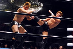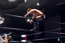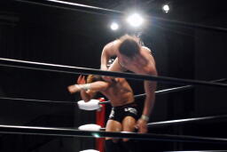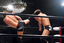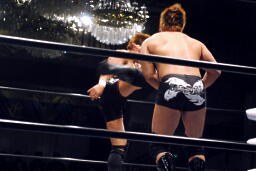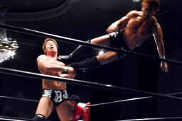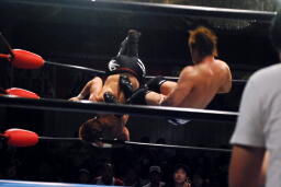 稔はKAIをコーナーに上げて雪崩式ハーフハッチ狙うがKAIは突き落としてミサイルキック(左写真)。稔場外エスケープ、KAIトペ・スイシーダ。