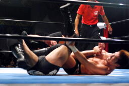 アームロック(左写真)、KAIロープ。稔エルボースタッブ、ブレーンバスターの体勢、KAIブロックするが稔はワキ固め。