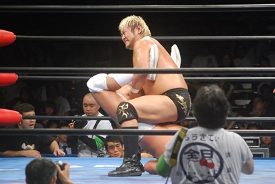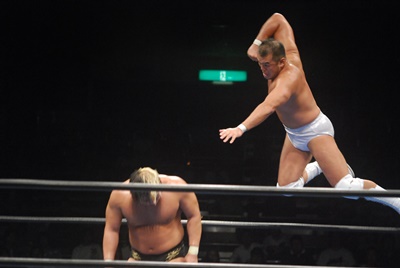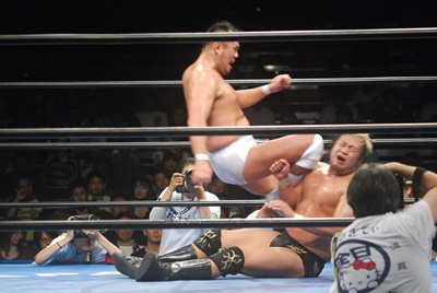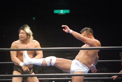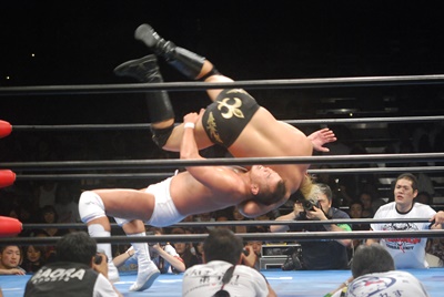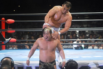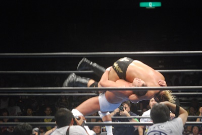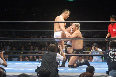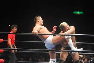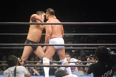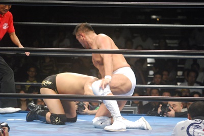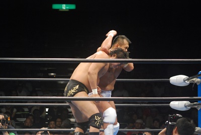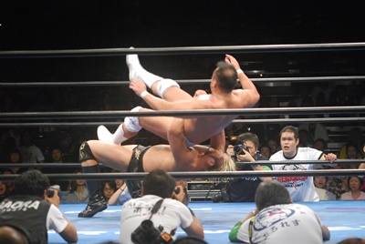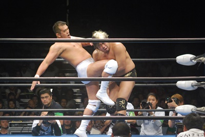諏訪魔ジャーマン(左写真)で投げ合う。