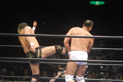 ビッグブーツ打ち合い、ラリアット相打ち、秋山ラリアット、両者ダウン。諏訪魔立ち上がるとドロップキック(右写真)。