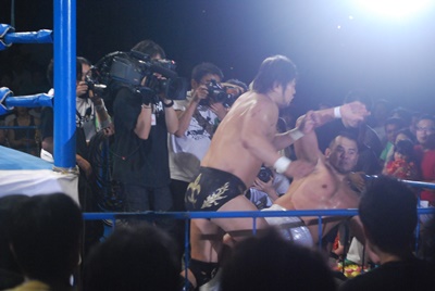諏訪魔突っ込む、秋山カウンターのキック、コーナーに上ってダイブ、諏訪魔ラリアットで撃墜(右写真)。両者ダウン。20分経過。
