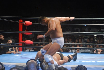 秋山ヒザ蹴り(左写真)、コーナーに振る、諏訪魔切り返す。