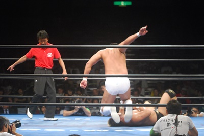 先に起きた諏訪魔が串刺しラリアットからベリートゥベリー(左写真)、カウント2。