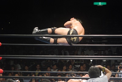 コーナーに上って後頭部にダイビングエルボー(右写真)。