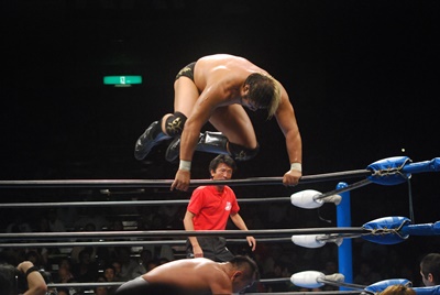 秋山が連発(左写真)、諏訪魔は場外に転落。秋山追う。