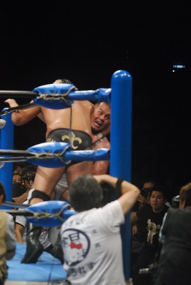 秋山コーナーに上る、諏訪魔も上り雪崩式ブレーンバスター(左写真)、カウント2。15分経過。