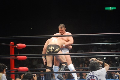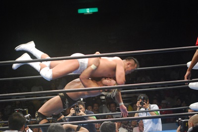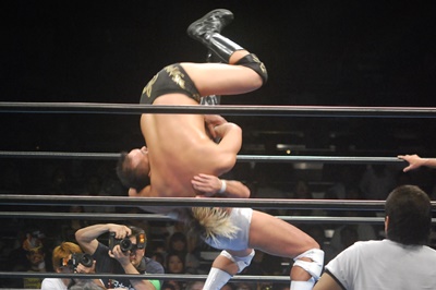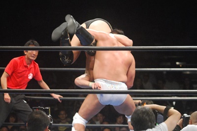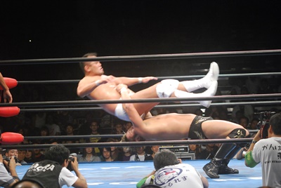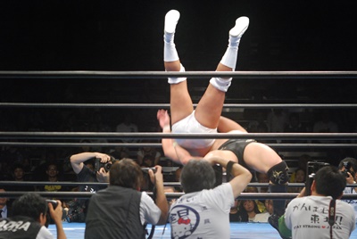 諏訪魔バックドロップ、秋山は体をあびせて押しつぶす(右写真)。