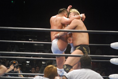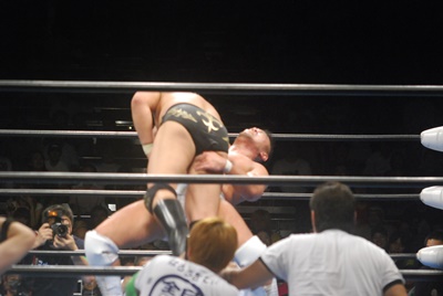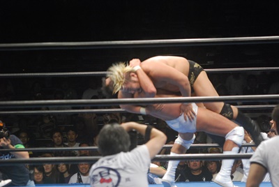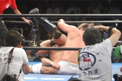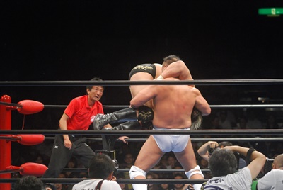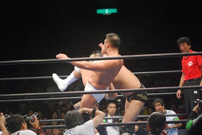 ジャーマンスープレックス(左写真)、カウント2。25分経過。