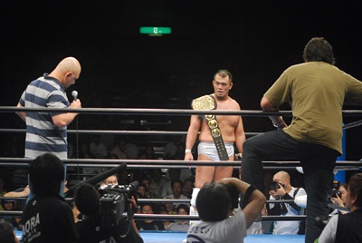 秋山はノアでの防衛戦希望。「誰か取りに来いよ。」ケアがリングサイドに。
