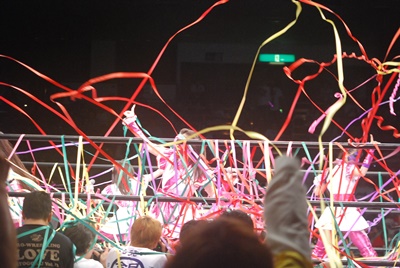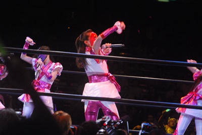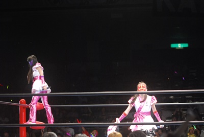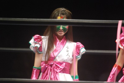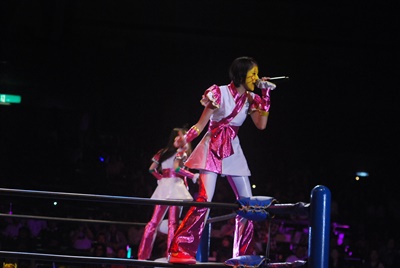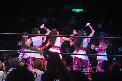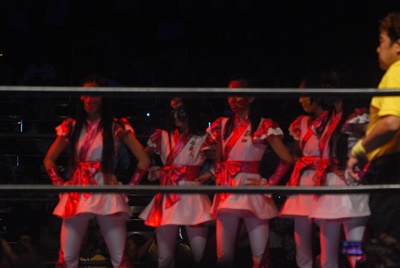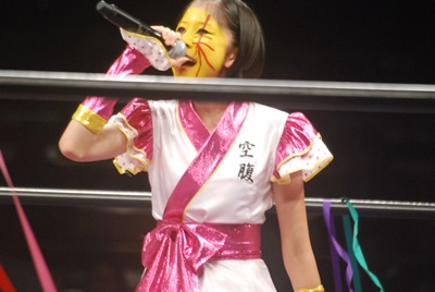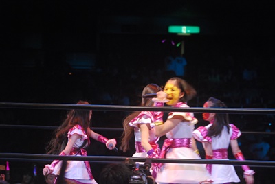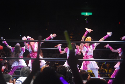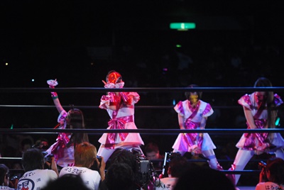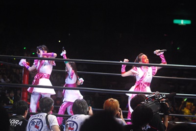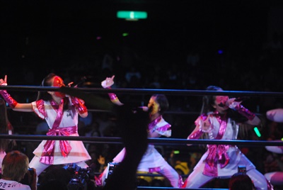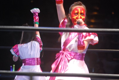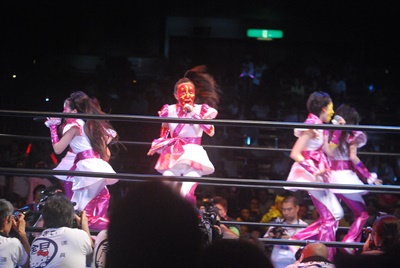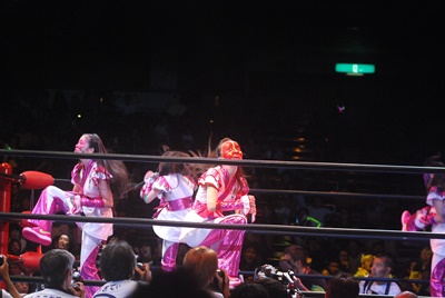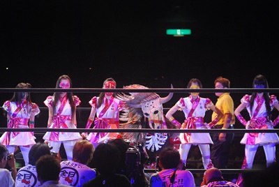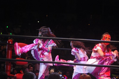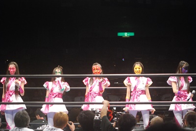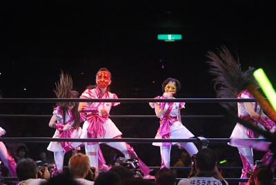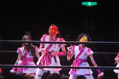 ムタ風の頭巾を着けてももいろクローバーZ、ではなくグレートクローバーZが花道を入場(右写真)。