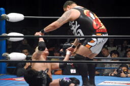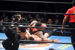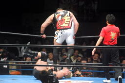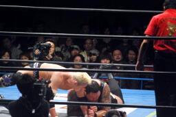 曙エルボードロップ、船木かわして十字に(右写真)、浜がエルボードロップでカット。10分経過。曙は浜にタッチ。