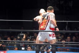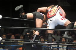 船木ロープに飛んでクロスボディ、曙キャッチ(右写真)。