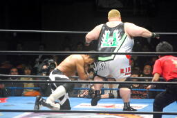 ボディスラムからスチームローラー(右写真)、カウント2。曙にタッチ。