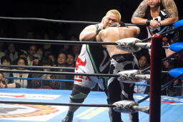 河野ヒザ蹴り(右写真)、船木にタッチ。