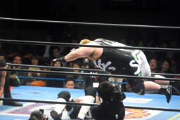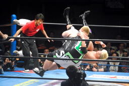 曙がロープ際の河野にラリアット、両者同体で場外転落(左写真)。