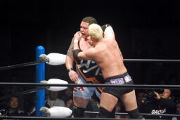 ショルダーブロック打ち合い(右写真)、河野ロープに飛ぶ、