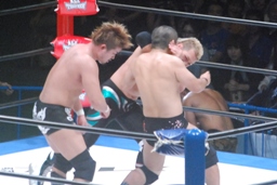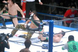 鼓太郎ジャンプしてヒザで押しつぶす(左写真)鼓太郎エルボー、金本ソバット、KENTAにタッチ。10分経過。
