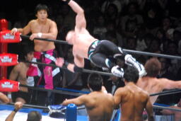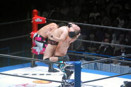 コーナーに上ってスプラッシュ・プランチャ(左写真)、平柳を圧殺、カウント3。