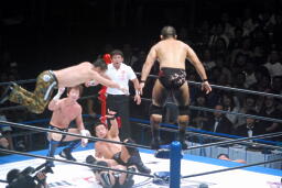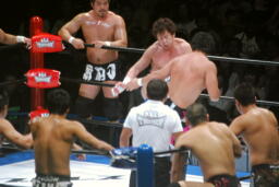 殴り合い(右写真)。中嶋が顔面ウォッシュ狙うが金本ブロック。金本KENTAにタッチ。中嶋ブレーンバスター、田口にタッチ。