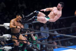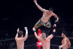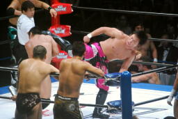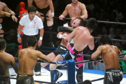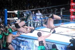KENTAが押さえて金丸がコーナーからダイビングボディアタック(右写真)。