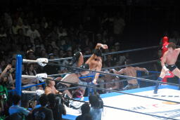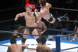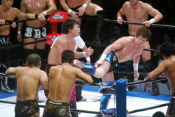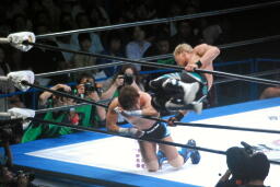 金丸は田口にエルボー、ドロップキック浴びせ(右写真)脱出、金本にタッチ。
