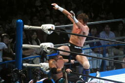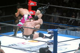 平柳がブレーンバスター、コーナーに上る。金丸がダイビングボディプレス(左写真)。