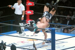稔がコーナーに走る、デヴィット追走式串刺しドロップキック(左写真)。垂直落下式ブレーンバスター。稔ハイキック、デヴィットかわしてオーバーヘッドキック、中嶋にタッチ。