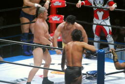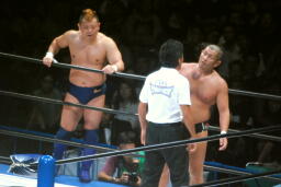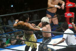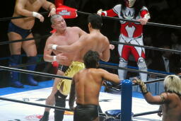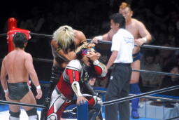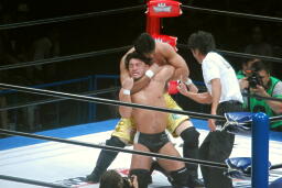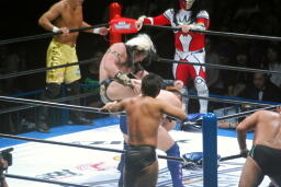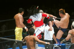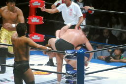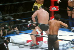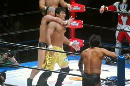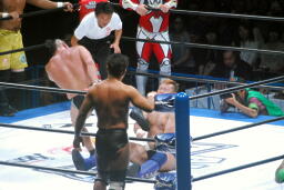 タイチ握手と見せかけて急所蹴り(左写真)、青木にタッチ。船木もライガーにタッチ。
