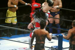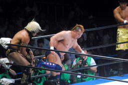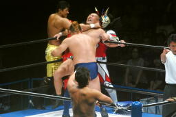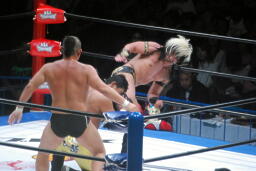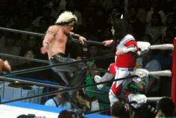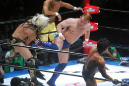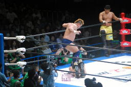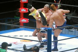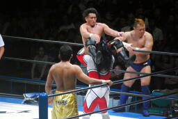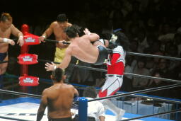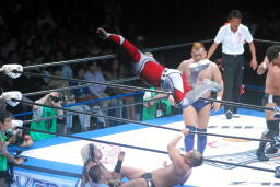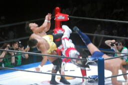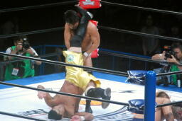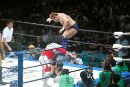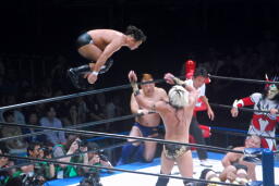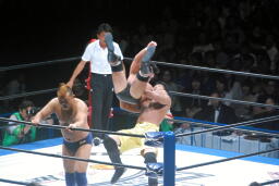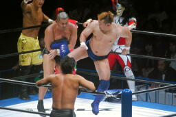 ロックアップ、ライガーヘッドロック、青木ロープに振る、ライガーショルダーブロック、ロープに飛ぶ、青木ドロップキック(右写真)。佐野と鈴木にタッチ。