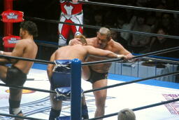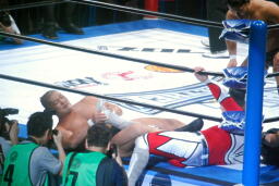 タイチロープに飛ぶ、ライガーキャッチして風車式バックブリーカー(右写真)、佐野にタッチ。