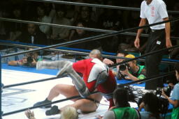 場外に落ちた鈴木にライガーがコーナーからプランチャ(左写真)。