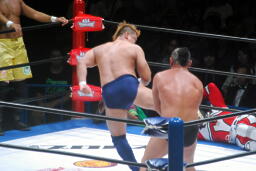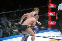 先発は船木と鈴木。かと思ったら鈴木はすぐにタイチにタッチ。ロックアップ、船木ロープに押し込む、タイチ体勢入れ替えてチョップ(右写真)、すぐに逃げる。